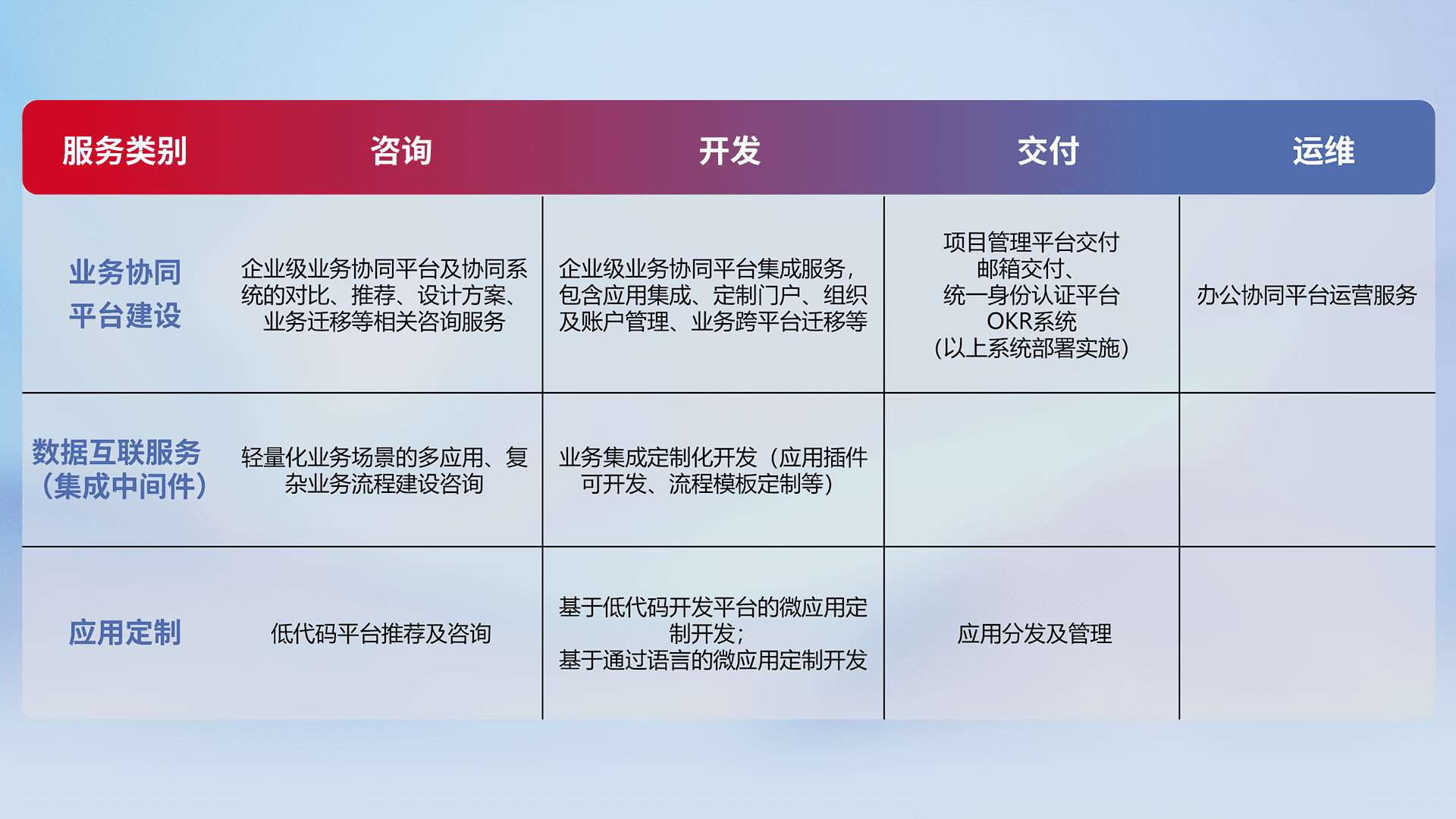 针对钉钉、、、、企微、、、IDaas等平台级产品提供产品的规划、、、方案、、、交付、、定制化开发等服务,,实现如统一协同办公、、、智能客户服务、、、混合会议管理、、、智能数据查询、、等业务场景,,实现数字化转型。。。。